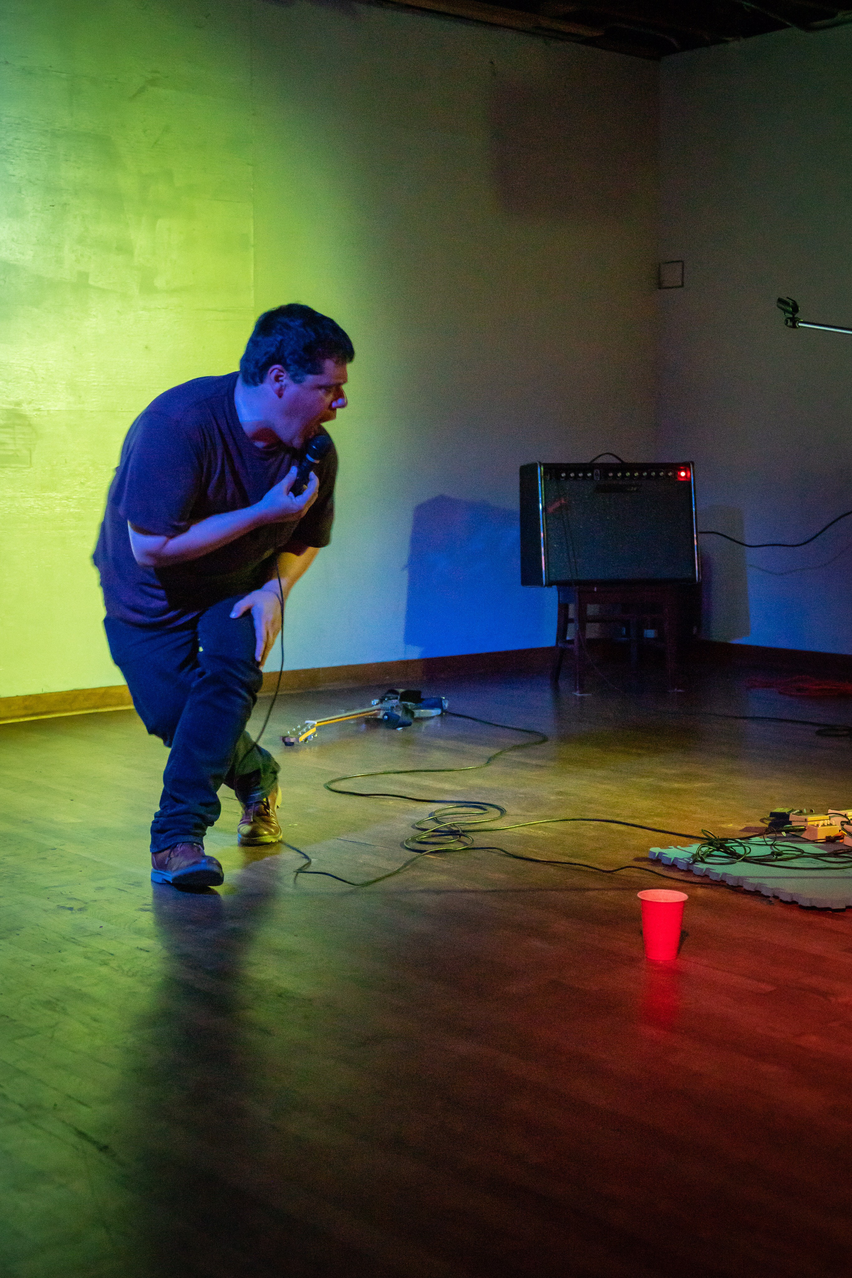 Sweaty crooner and solo guitar. But no. We don’t know when it starts, while in fact we’re already crushed into his piggery where the absurd minutes of music instruments and noise fetichists are running out. What he plays does not match what you hear. He gives his all, but it does not come out. He stops when it goes on. And then, in metallic waves, his whispers are chopped by insane solos with, it seems, an improperly plugged jack. Knees on the ground, surrounded by his own voices, the killing of the rocker never happens. Shredded into pieces, he is greater than ever, quirkier than ever.