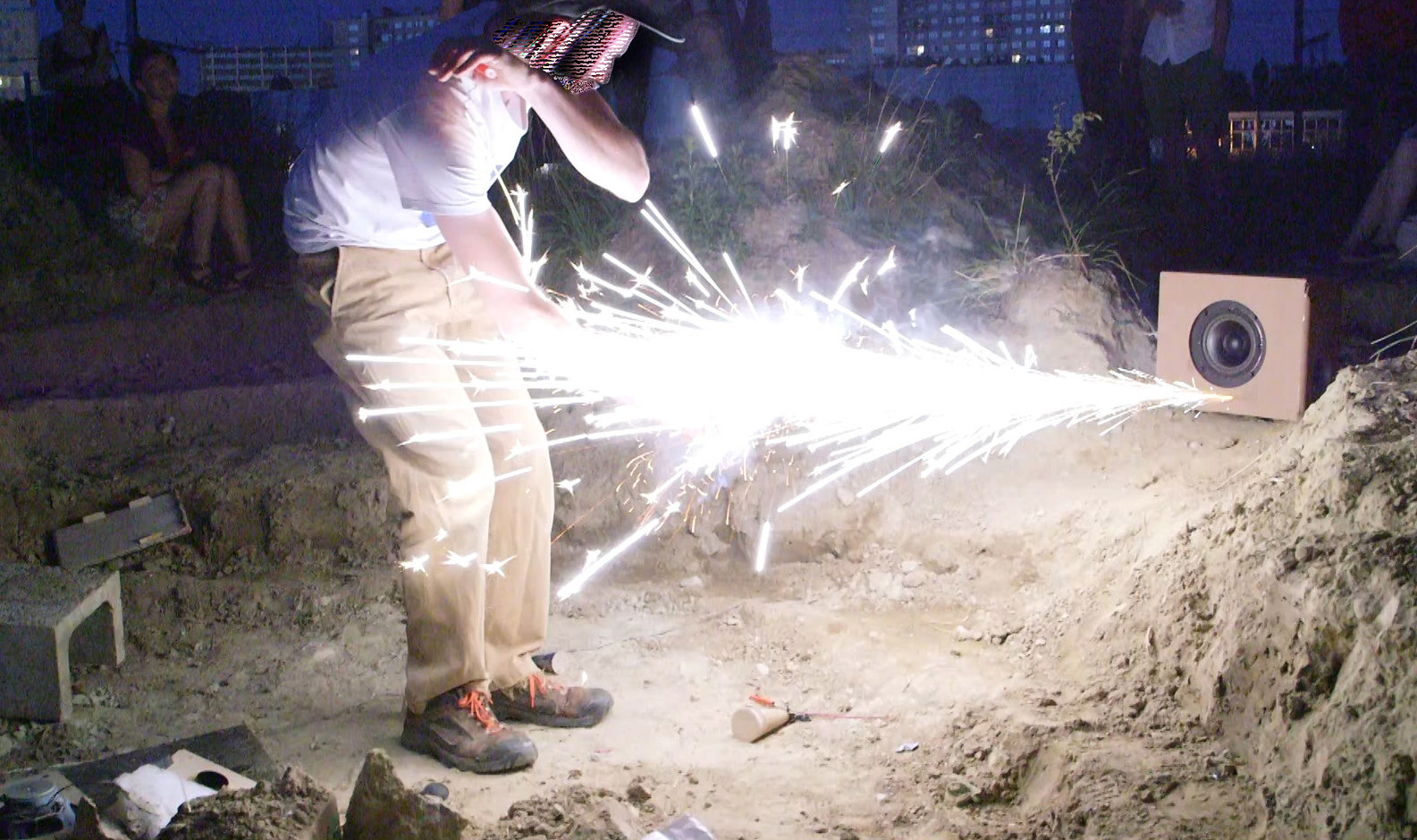Après ses actions en extérieur la veille, Davide Tidoni présente ses vidéos de rupture d'appareils audios-métaphore de l'existence.
